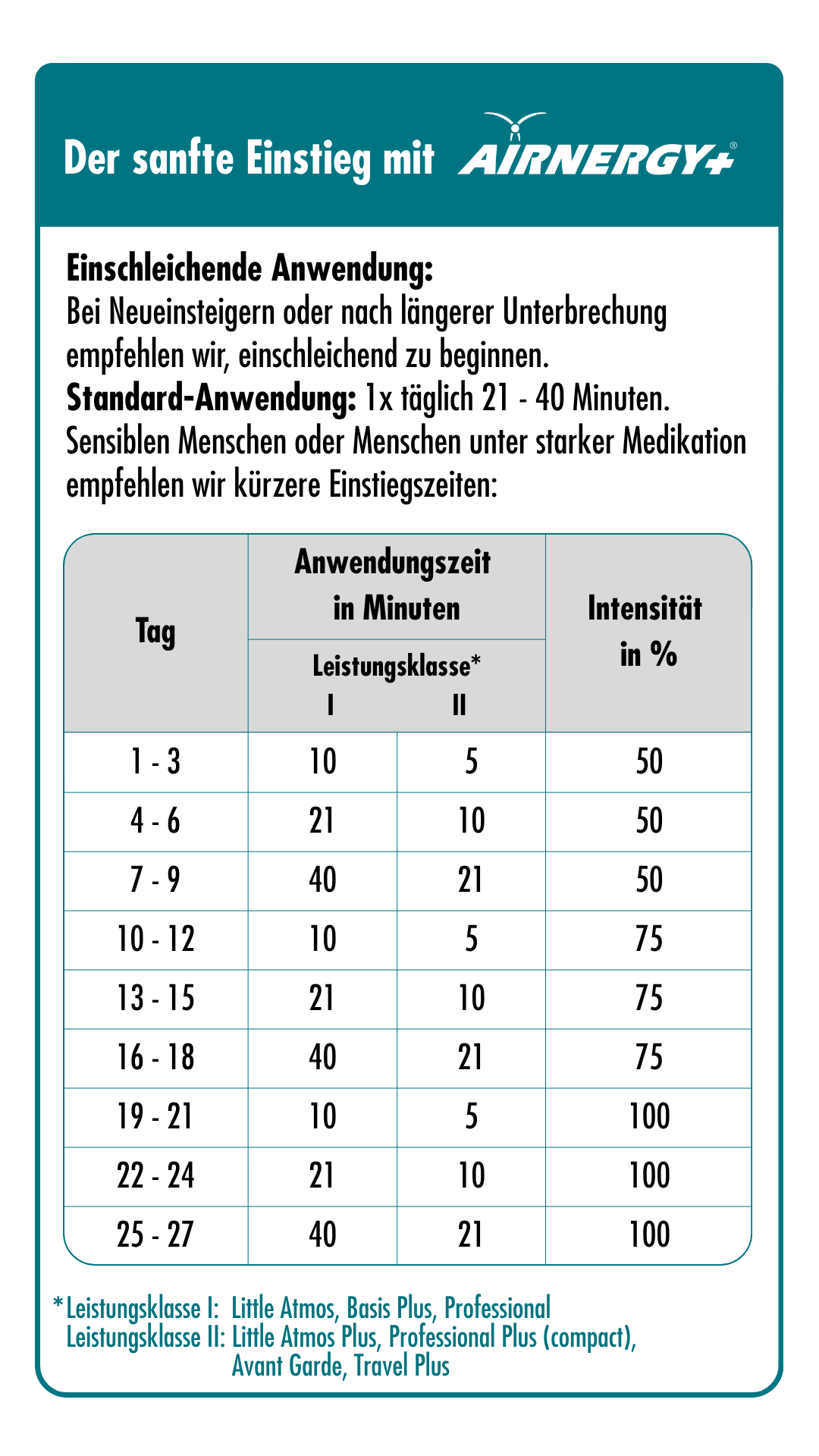 Zunächst einmal empfehlen wir bei Neueinsteigern oder nach einer längeren Unterbrechung der regelmäßigen Anwendung, einschleichend zu beginnen, um den Körper wieder daran zu erinnern. Die unterschiedlichen Leistungsstärken der einzelnen AIRNERGY-Systeme bedürfen unterschiedlicher Anwendungszeiten. Für jeden Einsatzbereich gibt es ein passendes Gerät.